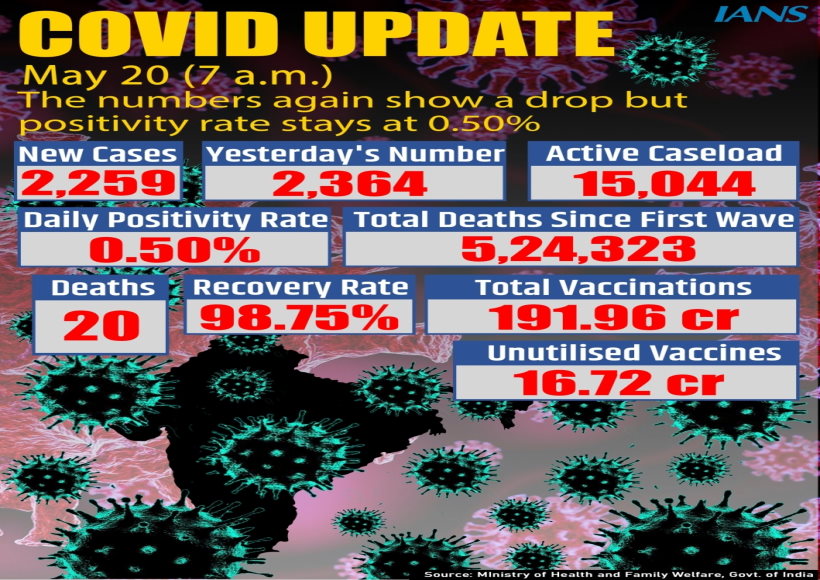 नई दिल्ली, 20 मई (युआईटीवी/आईएएनएस)- भारत ने पिछले दिन 2,364 संक्रमणों के मुकाबले 24 घंटे की अवधि में 2,259 ताजा कोविड मामलों में मामूली गिरावट दर्ज की। केंद्रीय स्वास्थ्य और परिवार कल्याण मंत्रालय ने शुक्रवार सुबह साझा किए आंकड़ों में इसकी जानकारी दी। इसी अवधि में, देश ने 20 कोविड मौतों की सूचना दी, जिससे देश भर में मरने वालों की संख्या 5,24,323 हो गई।