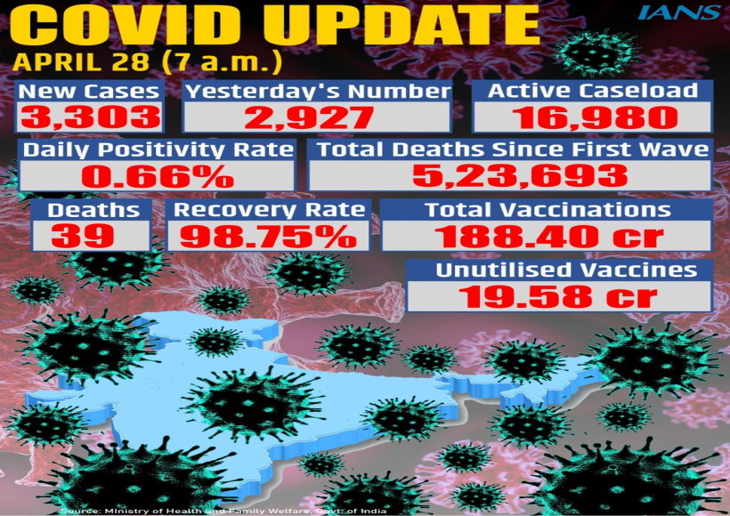 नई दिल्ली, 28 अप्रैल (युआईटीवी/आईएएनएस)- भारत में बीते 24 घंटे में कोरोना के 3,303 नए मामले सामने आए। इससे पहले बुधवार को कोरोना के 2,937 मामले दर्ज किए गए थे। ये जानकारी केंद्रीय स्वास्थ्य मंत्रालय ने गुरुवार को दी। देशभर में बीते 24 घंटे में कोरोना से 39 मौतें हुई, जिससे मरने वालों की संख्या बढ़कर 523,693 हो गई है।