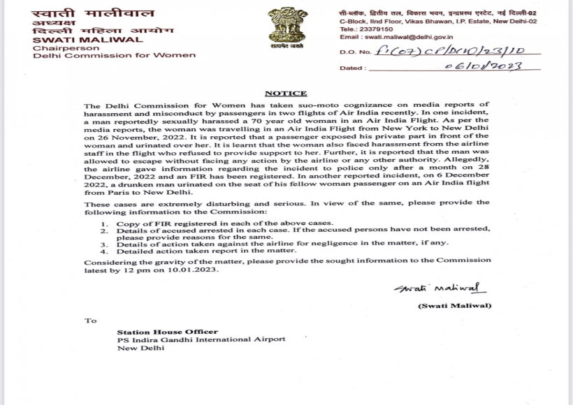 डीसीडब्ल्यू प्रमुख स्वाति मालीवाल ने डीजीसीए, एयर इंडिया और दिल्ली पुलिस से 10 जनवरी तक कार्रवाई रिपोर्ट उपलब्ध कराने को कहा है।
