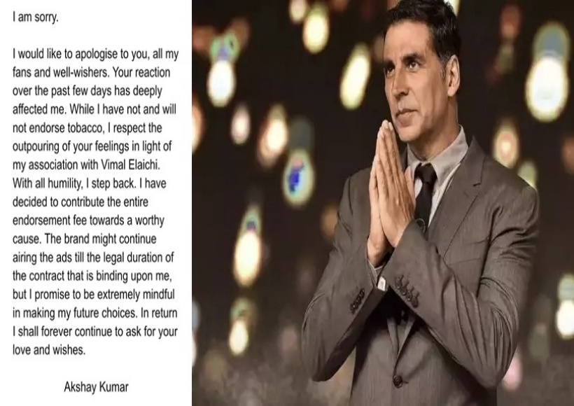 अपने नोट को आगे जारी रखते हुए, अक्षय ने लिखा कि वह अभी भी इंटरनेट पर सामने आए उस विशेष वीडियो में अपनी कही गई बातों पर कायम हैं, जबकि मैंने तंबाकू का समर्थन नहीं किया है और न ही करूंगा, मैं विमल इलायची के साथ अपने जुड़ाव के आलोक में आपकी भावनाओं का सम्मान करता हूं, और पूरी विनम्रता के साथ इस जुड़ाव से मैं पीछे हटता हूं। मैंने पूरे समर्थन शुल्क को एक योग्य कारण के लिए दान करने का फैसला किया है।