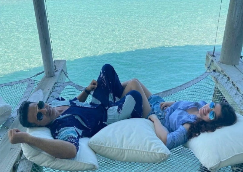 तस्वीर में अक्षय और ट्विंकल दोनों को मालदीव में पानी के ऊपर एक झूला पर आराम करते देखा जा सकता है।