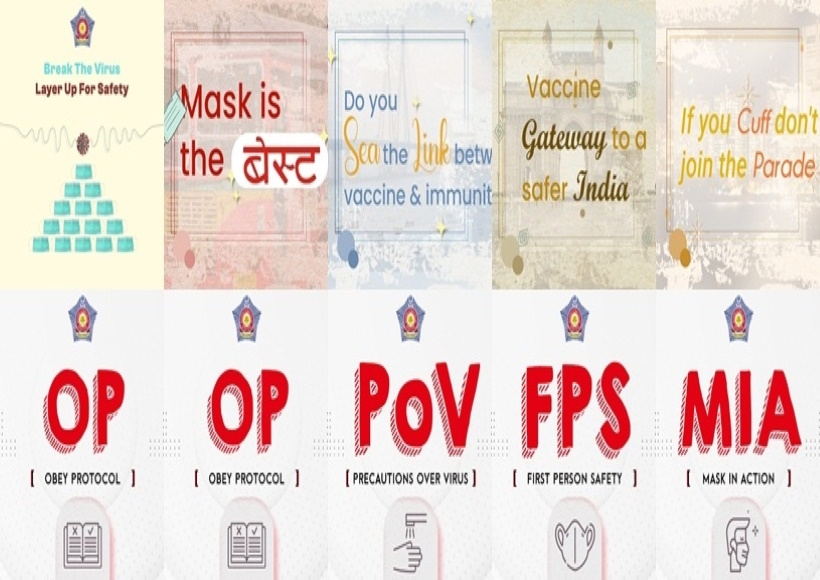 घर तक पहुंचने के लिए, पुलिस ने ‘लिंगो-प्ले’ में प्रतिष्ठित शहर के स्मारकों के साथ खिलवाड़ किया है, जैसे, ‘वैक्सीन गेटवे टू ए सेफ इंडिया’, ‘डू यू सी द लिंक बिटवीन द वैक्सीन एंड सेफ्टी’, ‘इफ यू सीयूएफएफ डॉन्ट ज्वाइन द परेड’ या ‘मास्क इज द बेस्ट’।