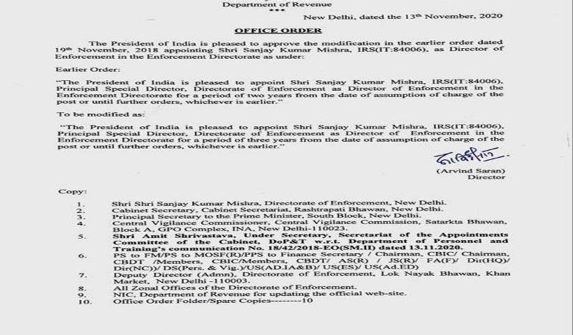 View More प्रवर्तन निदेशालय के निदेशक एसके मिश्रा का कार्यकाल 1 साल के लिए बढ़ा