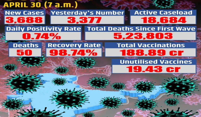 नई दिल्ली, 30 अप्रैल (युआईटीवी/आईएएनएस)- भारत में शनिवार को कोरोना के 3,688 नए मामले सामने आए। इससे पहले शुक्रवार को कोरोना के 3,377 मामले दर्ज…