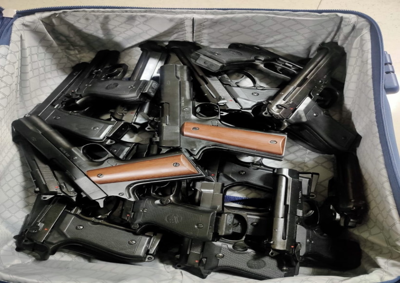 बरामद बंदूकों के साथ दो ट्रॉली बैगों को जब्त कर लिया गया और यात्रियों को सीमा शुल्क अधिनियम की धारा 104 के तहत गिरफ्तार कर लिया गया।