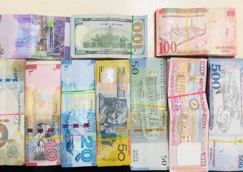 अधिकारियों ने यूएस और ऑस्ट्रेलियाई डॉलर, संयुक्त अरब अमीरात दिरहम सऊदी रियाल, बहरीन दीनार, कुवैती दीनार और ओमानी रियाल जैसे विदेशी मुद्रा पाया।