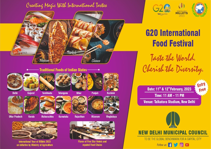 नई दिल्ली, 10 फरवरी (युआईटीवी/आईएएनएस)| नई दिल्ली नगरपालिका परिषद 11 और 12 फरवरी 2023 को नई दिल्ली के तालकटोरा इंडोर स्टेडियम में टेस्ट द वर्ल्ड और इंटरनेशनल इयर ऑफ मिलेट्स की थीम पर जी20 फूड फेस्टिवल का आयोजन कर रही है। फूड फेस्टिवल का उद्घाटन भारत सरकार के आवास और शहरी मामलों के मंत्री हरदीप सिंह पुरी द्वारा शनिवार, 11 फरवरी को किया जाएगा । गौरतलब है कि इस फूड फेस्टिवल में जी20 समूह के 4 देश — चीन, तुर्की, जापान और मैक्सिको अपने अंतर्राष्ट्रीय व्यंजनों के साथ भाग ले रहे हैं। भारत के 14 राज्य जैसे – गुजरात, तमिलनाडु, तेलंगाना, दिल्ली, बिहार, पंजाब, कश्मीर, यूपी, केरल, महाराष्ट्र, कर्नाटक, राजस्थान, मिजोरम और मेघालय भी मोटा अनाज के पारंपरिक व्यंजनों के साथ इस फूड फेस्टिवल में भाग ले रहे हैं।