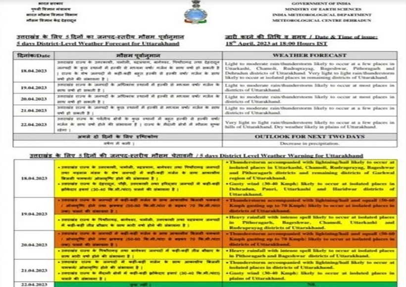 वहीं, राज्य के पिथौरागढ़, बागेश्वर, चमोली, उत्तरकाशी तथा रुद्रप्रयाग जनपद में कहीं-कहीं तेज बौछार के साथ भारी से बहुत भारी वर्षा होने की संभावना है। राज्य के शेष जनपदों में कहीं-कहीं गर्जन के साथ आकाशीय बिजली चमकने तथा ओलावृष्टि की संभावना है।