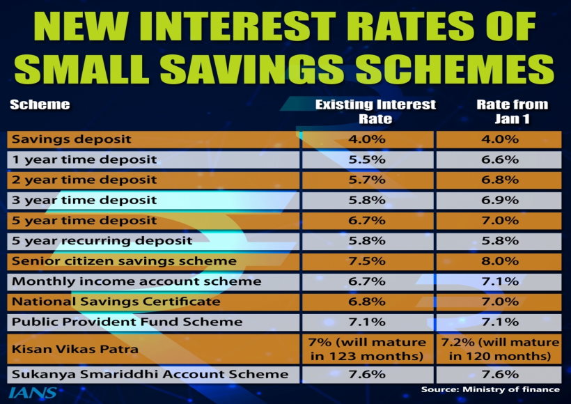 सीनियर सिटीजन सेविंग स्कीम जनवरी-मार्च की अवधि के दौरान 8 फीसदी की दर से ब्याज मिलेगा। केवीपी के लिए, सरकार ने ब्याज दरों में 7.2 प्रतिशत की बढ़ोतरी की है, हालांकि 120 महीने की कम परिपक्वता अवधि पर। वर्तमान में, केवीपी में 123 महीनों की परिपक्वता अवधि पर 7 प्रतिशत की ब्याज दर है। मासिक आय योजना 40 आधार अंक अधिक 7.1 प्रतिशत अर्जित करेगी, जबकि एनएससी ब्याज दर 20 आधार अंक बढ़ाकर 7 प्रतिशत कर दी गई है।