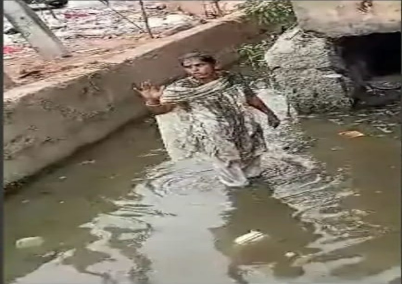 सफाई कर्मचारी गीता सिंह ने नाले में उतरकर सभी को चौंका दिया और अपने ऊपर गंदा पानी डाल लिया।