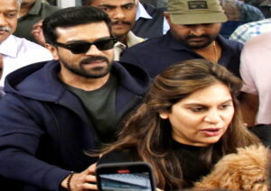 एयरपोर्ट पहुंचने पर राम चरण मुस्कुरा रहे थे और हाथ जोड़कर लोगों का अभिवादन स्वीकार कर रहे थे।