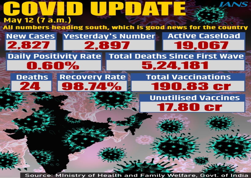 नई दिल्ली, 12 मई (युआईटीवी/आईएएनएस)- भारत ने गुरुवार को पिछले 24 घंटों में 2,827 ताजा कोविड मामले दर्ज किए। मामलों में पिछले दिन दर्ज किए गए 2,897 के मुकाबले मामूली गिरावट देखी गई। केंद्रीय स्वास्थ्य मंत्रालय द्वारा जारी आंकड़ों में इसकी जानकारी दी गई है। 24 नई मौतों के साथ मौतों की कुल संख्या 5,24,181 हो गई है।