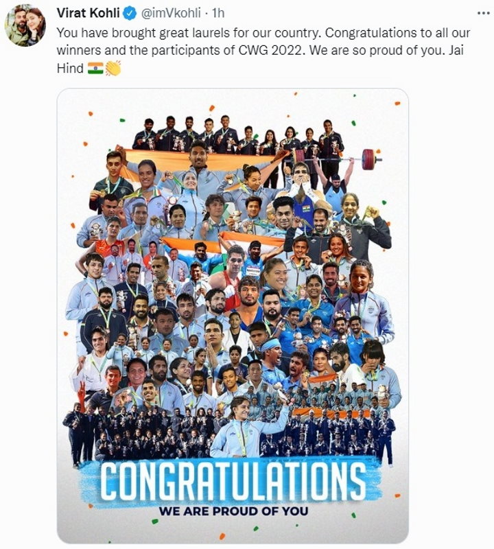 कोहली ने कू ऐप पर लिखा, “आप हमारे देश का नाम रोशन किया है। हमारे सभी विजेताओं और राष्ट्रमंडल गेम्स 2022 के प्रतिभागियों को बधाई। हमें आप पर बहुत गर्व है। जय हिंद।”